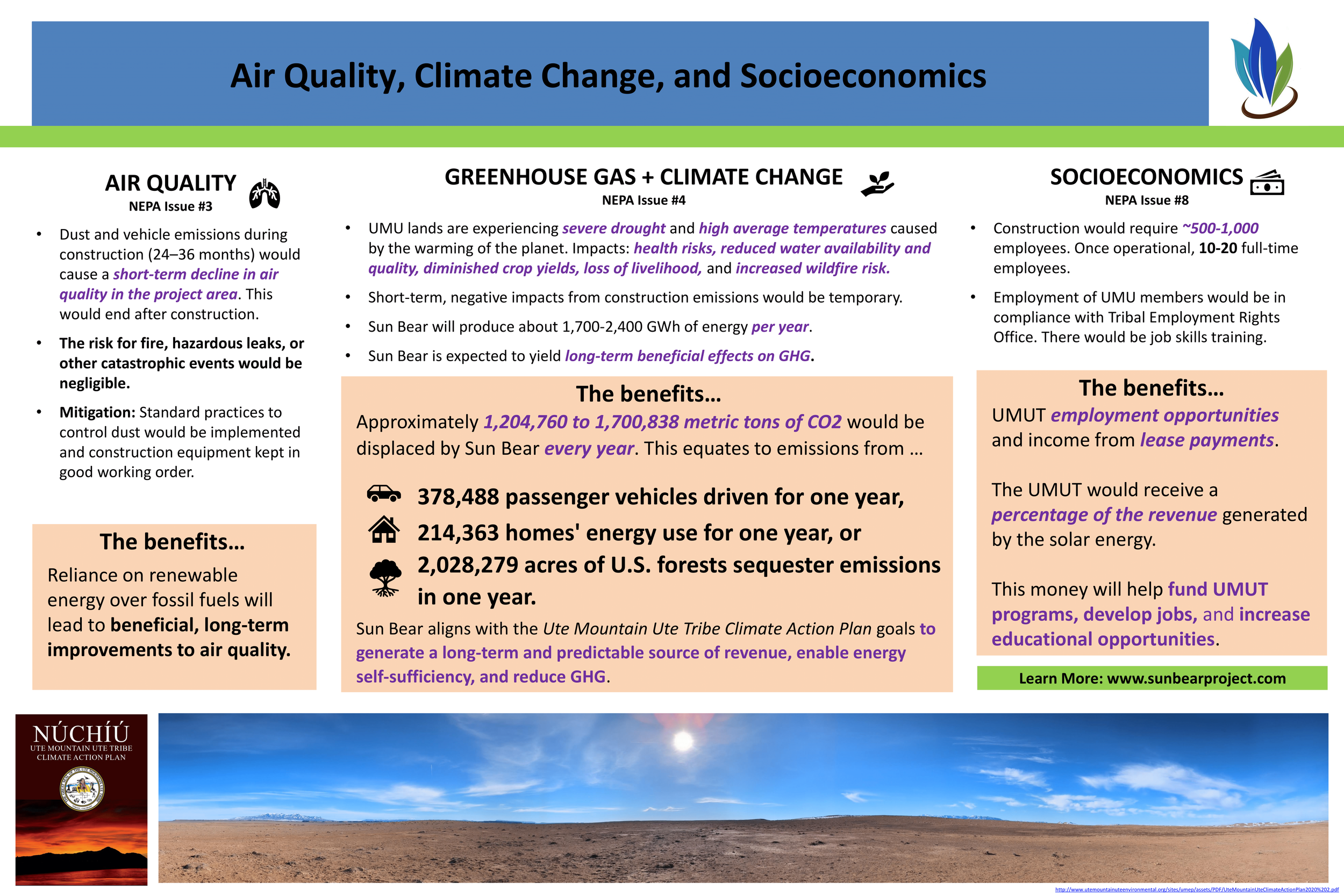 Sun Bear aligns with the Ute Mountain Ute Tribe Climate Action Plan goals to generate a long-term and predictable source of revenue, enable energy self-sufficiency, and reduce GHG.